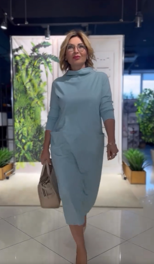 The dress is a perfect length, and paired with a matching green bag and brown boots, the overall style harmonizes and creates a stylish and individual look. The pockets add practicality and a fashionable touch.