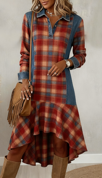 Denim Patchwork Plaid Print Ruffle Hem Midi Dress
